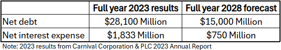From the full year 2023 report released in February 2024, Carnival reported a net profit of -$74 million whilst free cash flow was $997 million. This covered a large part of the debt repayment required in 2023, with cash covering the rest. This is due to increase in 2024 and should get to a point where it more than covers debt repayments due that year. - Fuel costs