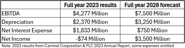 A return to maximising occupancy, putting new ships into service and price inflation should lead to a notable increase in EBITDA. With depreciation and interest expenses subtracted, that should leave a net profit of at least $3.5 Billion or $2.5/£1.85 earnings per share in 5 years time (2028). Carnival was earning $3+ Billion in net income before Covid, so this figure may be conservative.