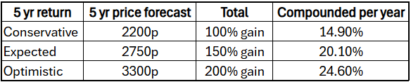 I don’t expect dividends or share buybacks from Carnival for many years, repairing its balance sheet is the focus and this will bring great returns through a major increase in its share price, if it succeeds. Anything further is considered a bonus. I invested in February 2024 at a price of 1090p when the full year 2023 results came out. Looking over a 5 year period I expect;